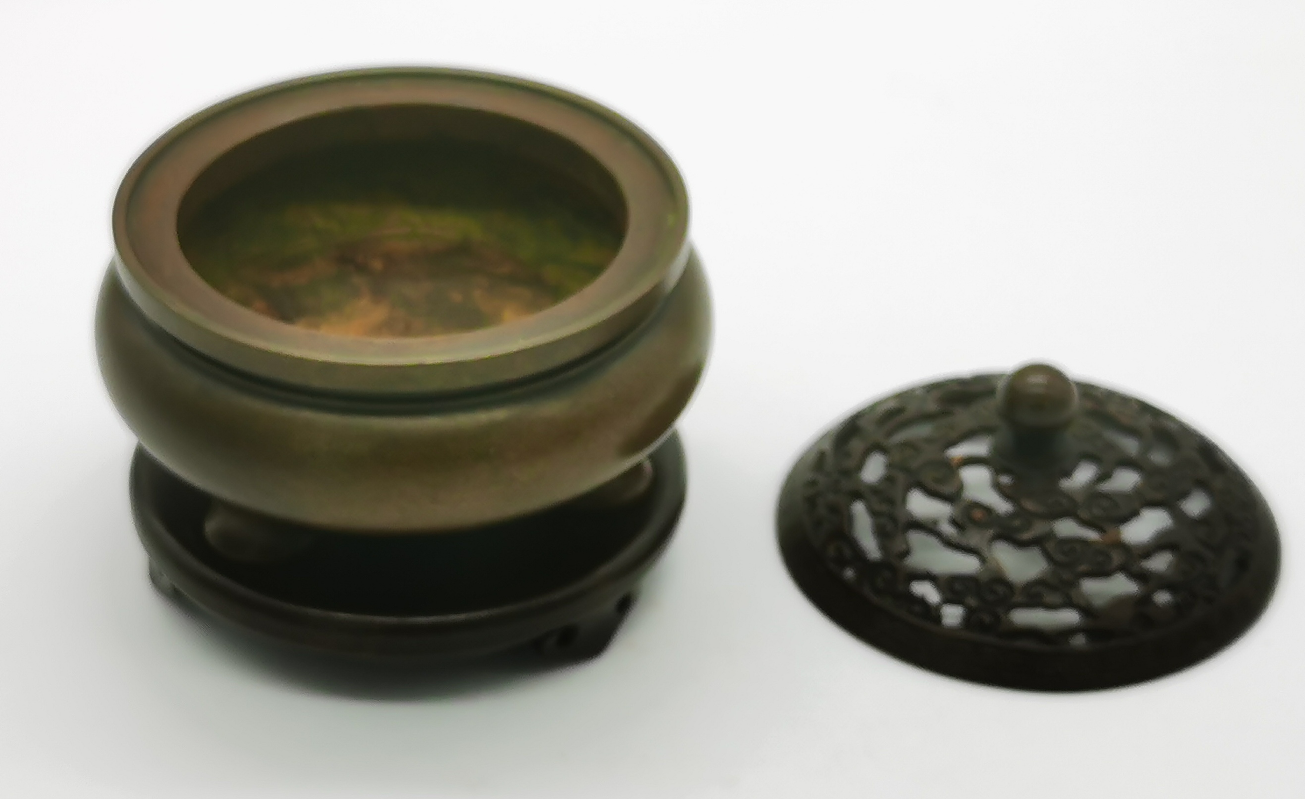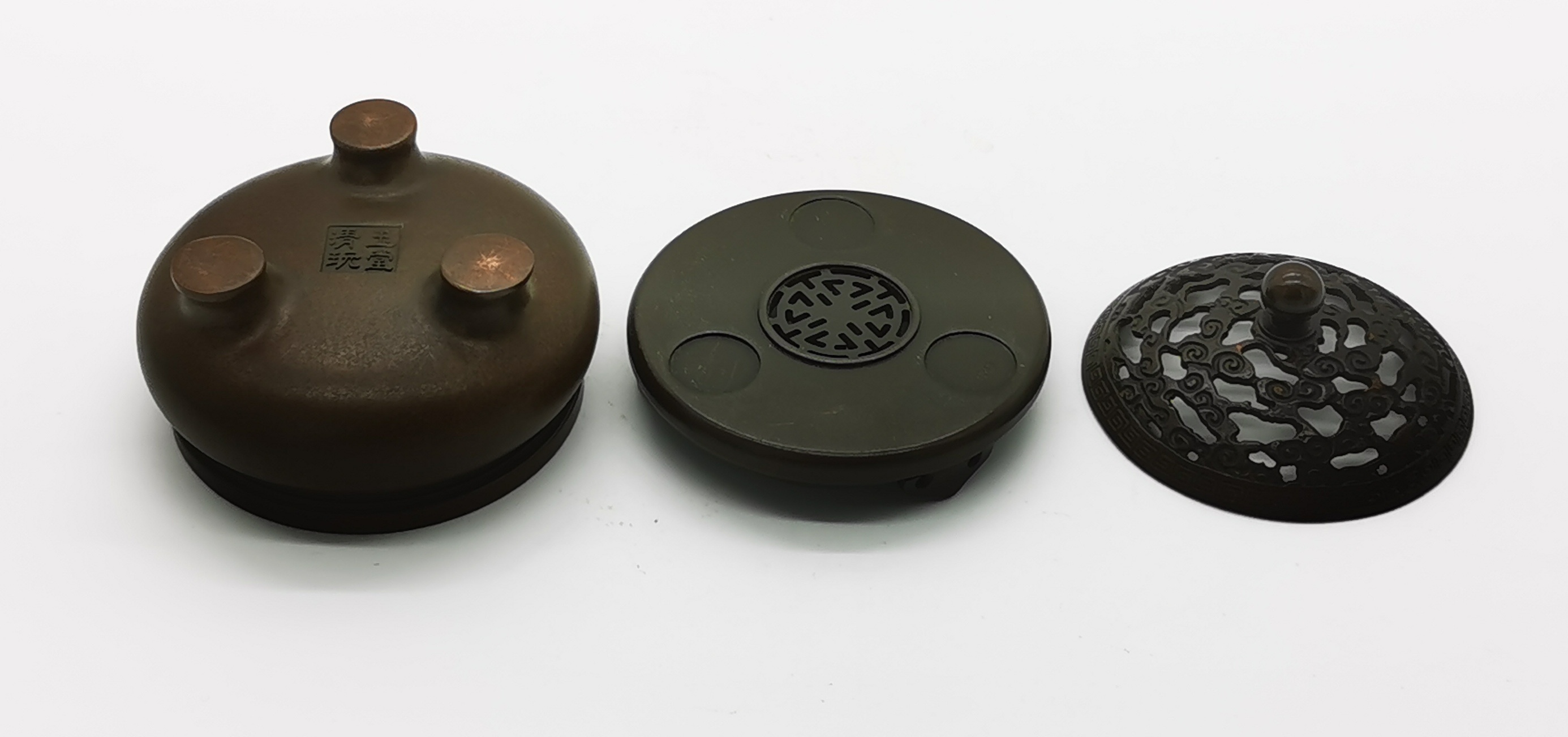 清代玉堂清玩款紫铜铸雕缕空云纹三足带底座熏香琴炉,
