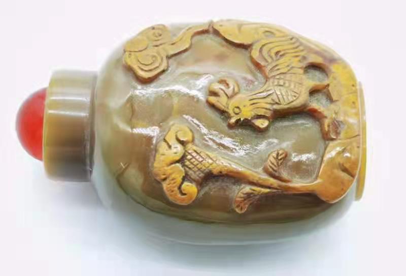 作者: 质地:民国玛瑙俏色浮雕大吉如意纹鼻烟壶 尺寸:5*7cm 0 3.1 创作时间: