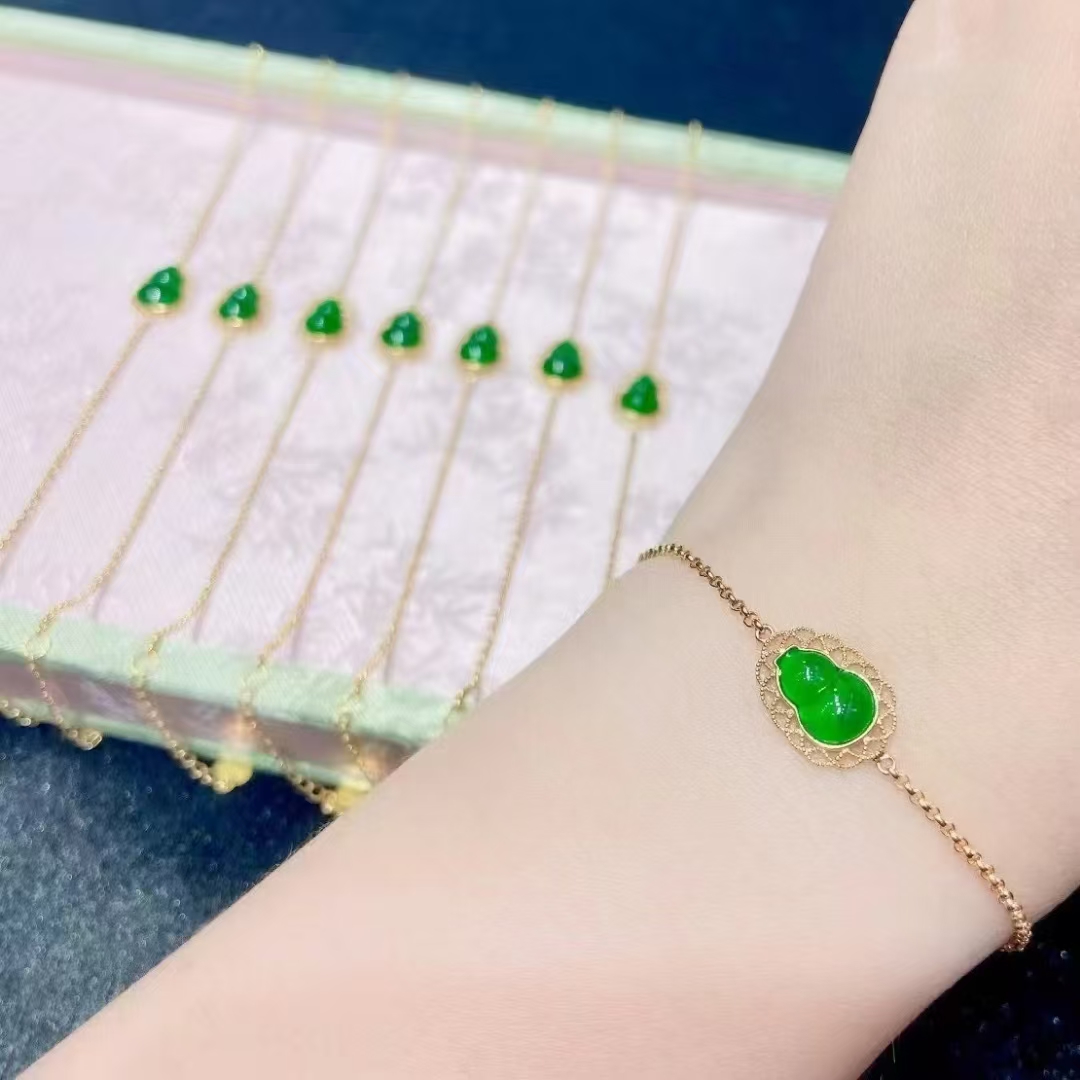 翡翠绿葫芦手链18 K厚金镶嵌(询价)