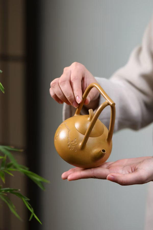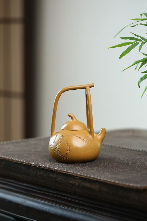 匏瓜提梁壶以自然植物匏瓜为原型,壶身圆润饱满,线条柔和,表现出匏瓜的丰硕与圆满。弯曲的瓜蒂为钮和流;三股由粗而细的提梁,前面搭成弓形,后一股弯曲搭在前面弯曲点处,宛如匏瓜的藤蔓,增加了壶的视觉层次感,展现出自然植物的形态美。壶身刻铭文,书法流畅,刻工精美,与壶相得益彰。