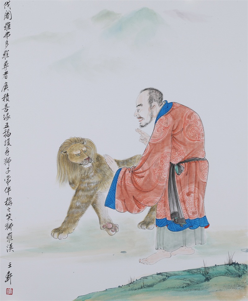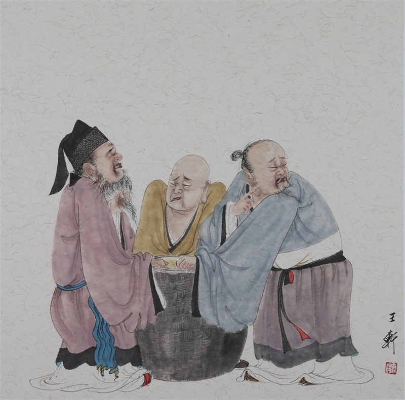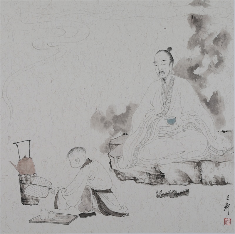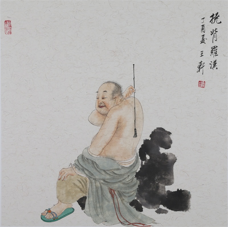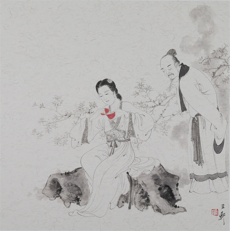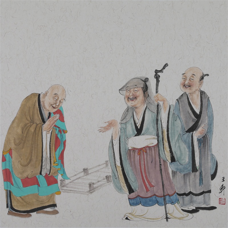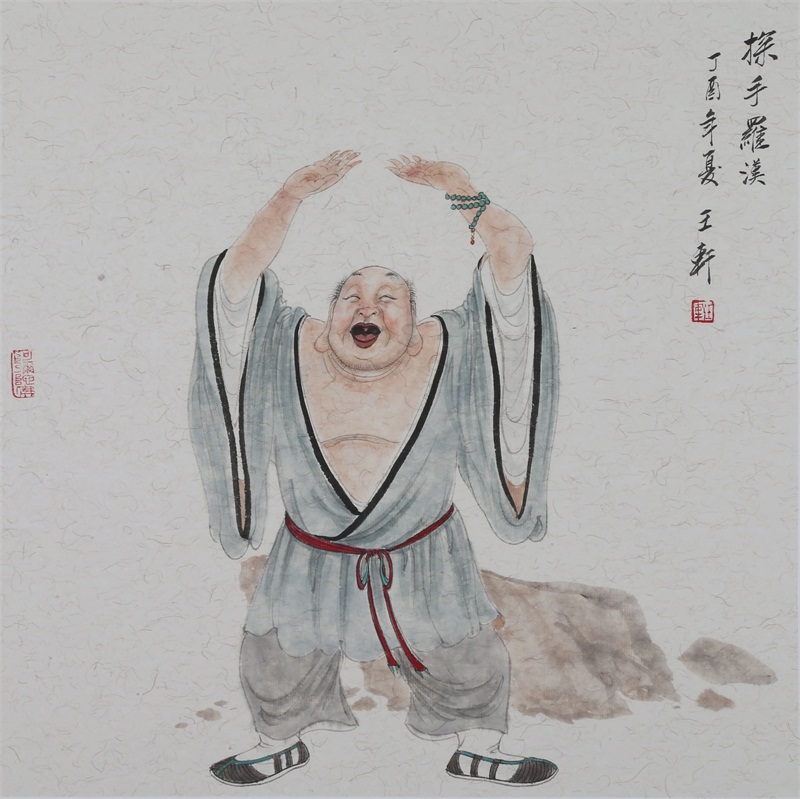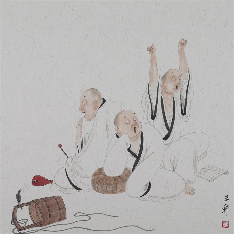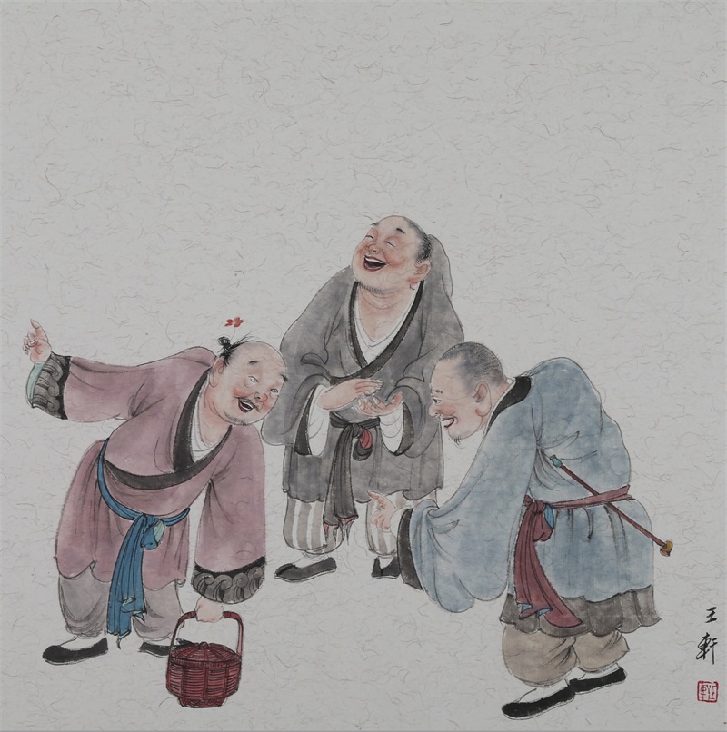 王轩的绘画以山水人物为主,从张大千到亚明,漫长的学习过程,使他累积了丰富的理性知识,掌握了深厚的绘画功底。众所周知,无论是张大千先生还是亚明老师,都对中国画的传统有着极为深刻的研究和认识,特别强调学生对传统的深度理解和反省。亚明老师在其理论著述和对学生教诲中,特别注重对传统理解与继承,中国画强调水墨线条的表现力,除造型功能外,对其内在美尤为重视,画者的个性情感,通过水墨线条完美展现。王轩深悟老师的意图,在他擅长重彩人物画中,向我们展示了他对传统,特别对水墨线条的充分理解与微致把握,细笔人物对线条要求极高,但线条造型只在其次,更重要的是表达更深层的视觉理性和内在美,要求表现出韵律、变化、节奏和张力。细笔重彩人物由于要服从人物的本身特征,表现范围相对具体,表达方式变化局限,这更增大了绘画难度,特别要求画家对笔墨有驾驭能力。王轩的画中,无论多细的线条,都能有一个运笔的完整过程,或流畅或沉稳,转折自如,笔断意连,恬淡绵静,朴实自然,无论人物众多的场面,还是小品特写都描绘的含蓄有致,个性明显。我认为王轩兄拥有“更从平淡见天真”的可贵气息。