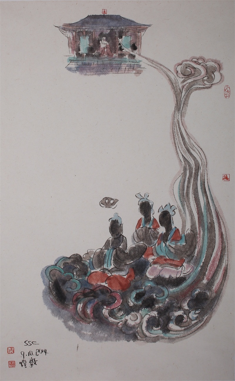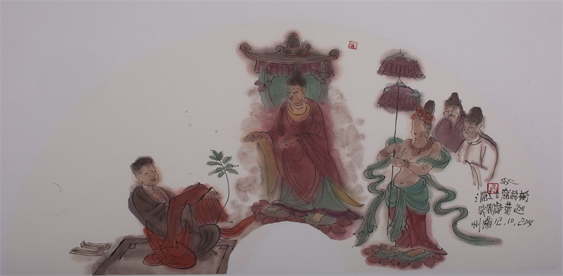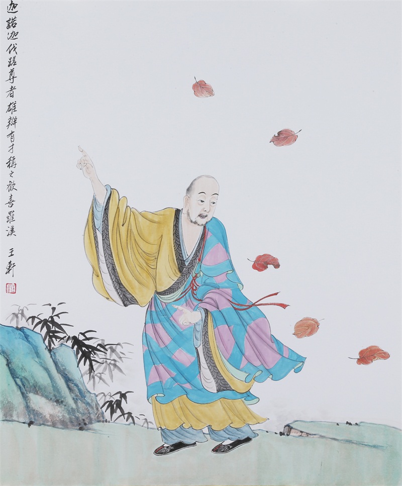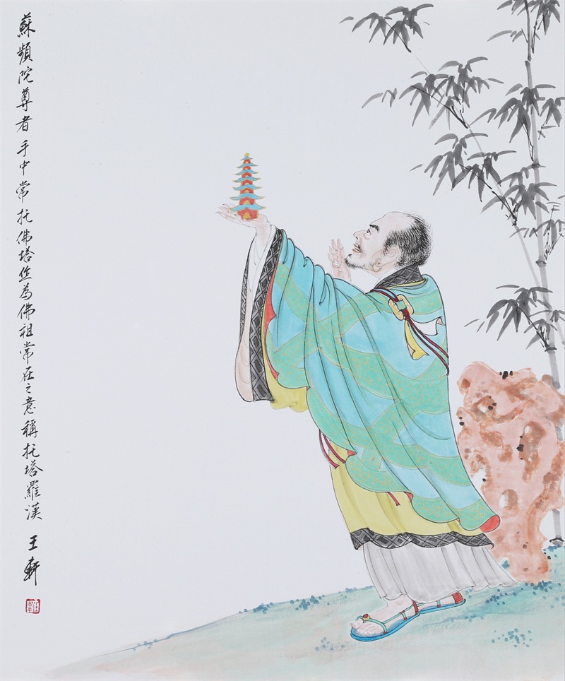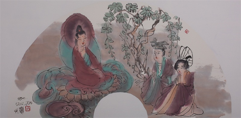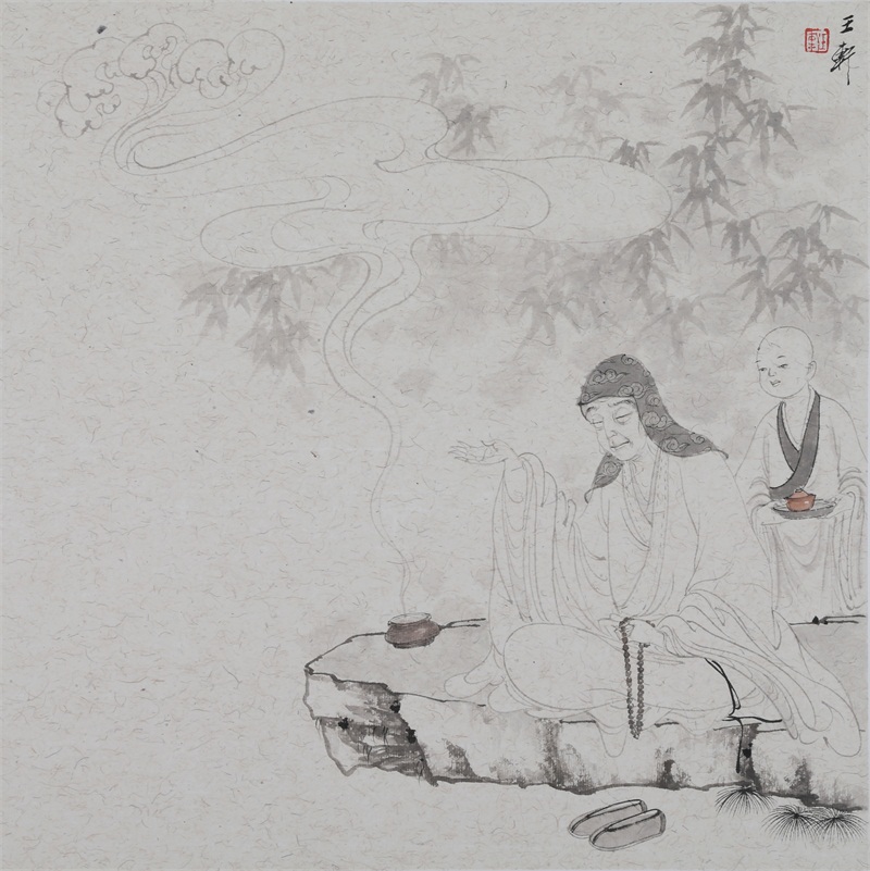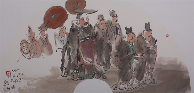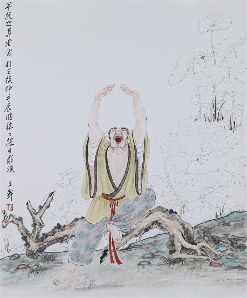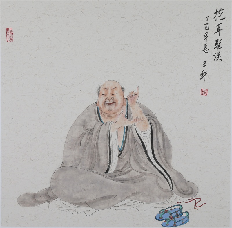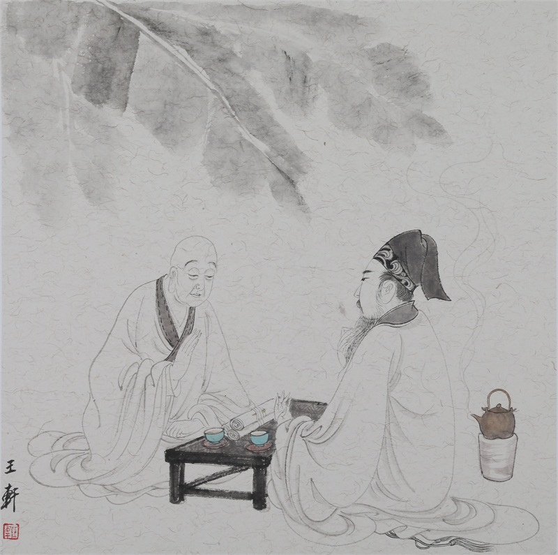 王轩的绘画以山水人物为主,从张大千到亚明,漫长的学习过程,使他累积了丰富的理性知识,掌握了深厚的绘画功底。众所周知,无论是张大千先生还是亚明老师,都对中国画的传统有着极为深刻的研究和认识,特别强调学生对传统的深度理解和反省。亚明老师在其理论著述和对学生教诲中,特别注重对传统理解与继承,中国画强调水墨线条的表现力,除造型功能外,对其内在美尤为重视,画者的个性情感,通过水墨线条完美展现。王轩深悟老师的意图,在他擅长重彩人物画中,向我们展示了他对传统,特别对水墨线条的充分理解与微致把握,细笔人物对线条要求极高,但线条造型只在其次,更重要的是表达更深层的视觉理性和内在美,要求表现出韵律、变化、节奏和张力。细笔重彩人物由于要服从人物的本身特征,表现范围相对具体,表达方式变化局限,这更增大了绘画难度,特别要求画家对笔墨有驾驭能力。王轩的画中,无论多细的线条,都能有一个运笔的完整过程,或流畅或沉稳,转折自如,笔断意连,恬淡绵静,朴实自然,无论人物众多的场面,还是小品特写都描绘的含蓄有致,个性明显。我认为王轩兄拥有“更从平淡见天真”的可贵气息。